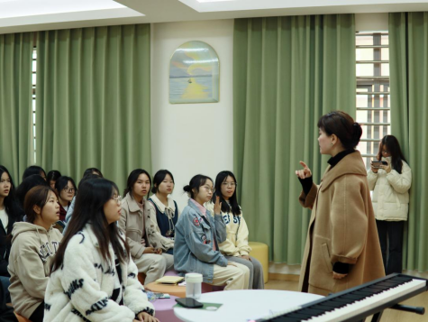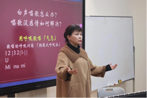 活动开始,贺老师以一首动画片《大鱼海棠》主题曲《大鱼》导入引起同学们的共鸣,与同学们围绕音乐的内涵及意义展开热烈的讨论,强调音乐不仅能陶冶人的情操,更是科学长寿方法中的第一名。紧接着,贺老师为同学们娓娓讲述了《大鱼》歌曲背后的爱情故事,以及歌曲表达的意境之美,使大家在这极具渲染的氛围中深深感受到中国古风音乐的魅力,并对其产生了浓厚的兴趣。贺老师通过现场演绎“白声歌唱”与“呼吸歌唱”,深入分析了流行、民族和美声唱法的不同之处,指出唱歌要讲究共鸣,即所谓胸腔、腹腔、头腔的共鸣,并要掌握稳健的气息控制,打开喉咙使气、声、字、腔、情全部到位。在贺老师的指导下,同学们掌握了基础的气息练习,感受到了声音的醇厚,明白了良好的歌唱精神状态是一次好的歌唱表演的关键。