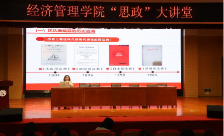 12 月 23日,在1102大学生活动中心,一场别开生面的普法活动热烈开展,经济管理学院的同学们齐聚一堂,深入探寻《民法典》的奥秘,主讲人为我院党总支副书记周敏,参与者涵盖大一、大二各班团支部代表、寝室长以及第 22、23 届团总支学生会全体成员。