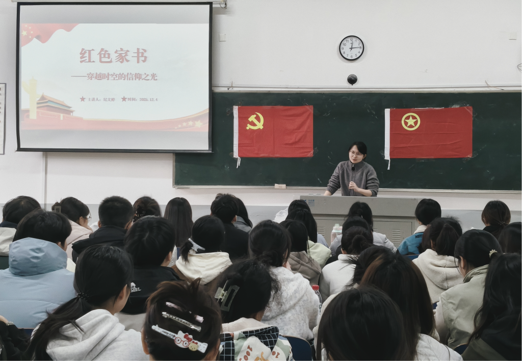 红色家书承载着革命先辈的赤胆忠诚,是滋养青年成长的精神沃土。为深入推进青年思想引领工作,传承红色基因,厚植家国情怀,近日,经济管理学院团总支书记纪文婷在2102A教室,以“红色家书——穿越时空的信仰之光”为题,为2025年入团积极分子和入党积极分子讲授专题团课,旨在引导青年学子从泛黄纸页中感悟信仰力量。