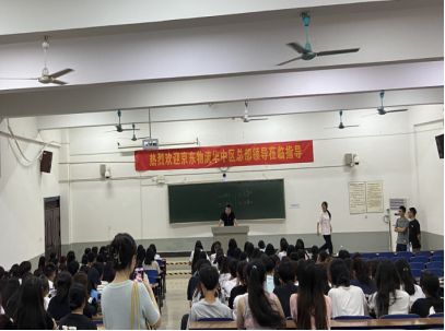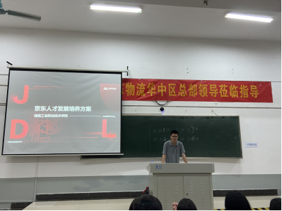 首先,湖北京邦达物流科技有限公司华中校企合作负责人陈骏飞通过视频宣传、PPT展示以及与学生面对面交流等方式,介绍了京东的发展历程、业务情况、员工成长路径,并从就业形势、行业发展、学生职业规划、“京东新锐之星”等方面深入浅出的介绍了京东特色班的培养模式、课程内容、实践计划等情况。