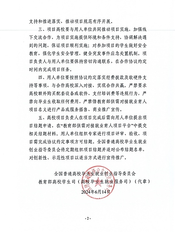 2024年6月14日,教育部第三期供需对接就业育人项目公布立项名单,我院“东莞百正重点群体就业帮扶项目”、“智慧物流定向人才培养项目”、“金拱门有限公司连锁餐饮运营管理定向人才培养项目”、“金拱门有限公司连锁餐饮运营管理人力资源提升项目”和“中联资产评估集团有限公司智慧金融服务人力资源提升项目”5个项目成功立项。