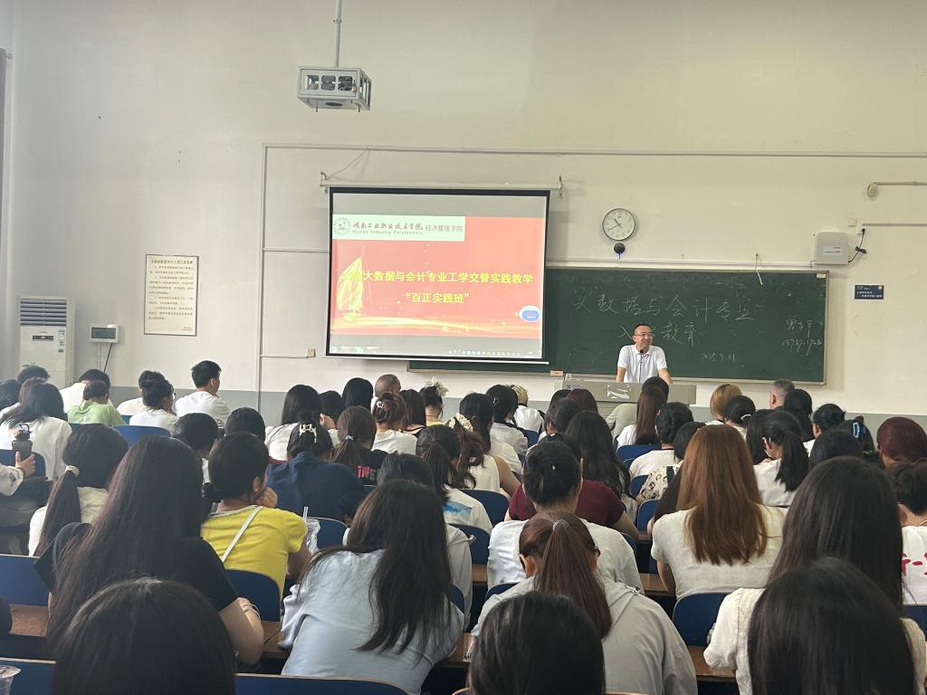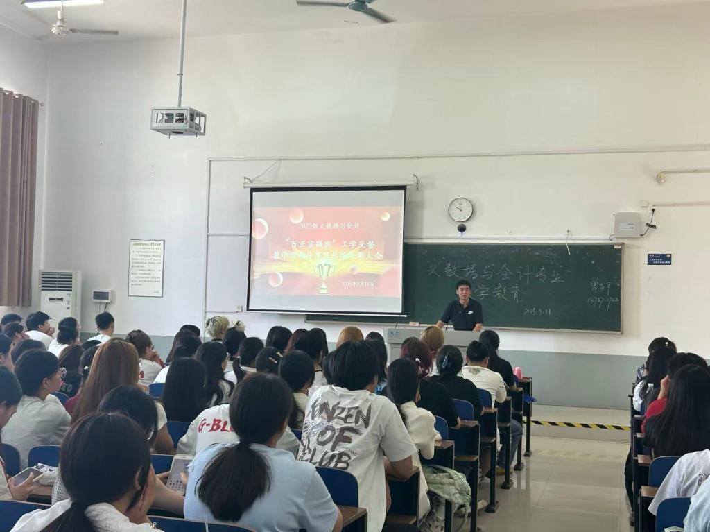 为全面总结工学交替教学成果,表彰先进典型,深化产教融合育人机制,于9月11日上午10点30分,经济管理学院大数据与会计专业2023级“百正实践班”工学交替教学活动分享及总结表彰大会在2202a教室隆重举行。学院党政领导、东莞百正税务师事务所有限公司总经理郭伟、专业教师及2023级学生共计150余人参会,现场气氛热烈,座无虚席。