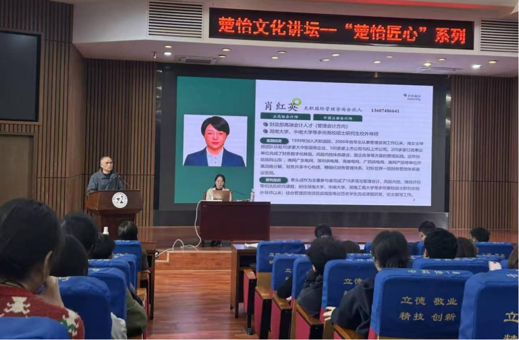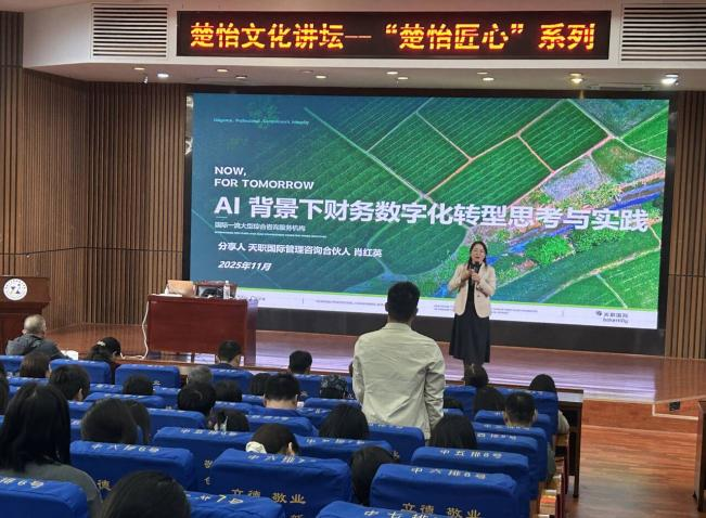 2025年11月4日下午,电子pg游戏平台下载经济管理学院“楚怡文化讲坛——楚怡匠心系列”学术报告在图书馆报告厅隆重举行。本次讲坛特邀我院1990级会计专业优秀校友、天职国际管理咨询合伙人、财政部高端会计人才肖红英教授重返母校,以《AI背景下财务数字化转型思路与实践》为题,为现场近300名师生带来一场融合前沿视野与实战智慧的学术盛宴。