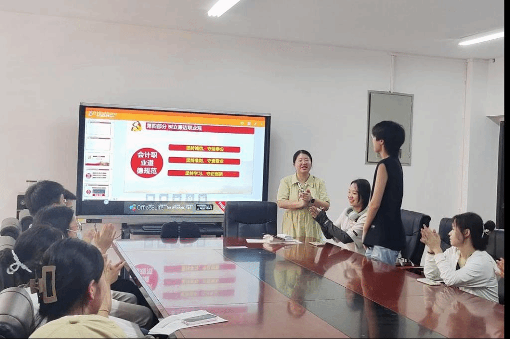 班会开始,莫思思老师通过分析廉洁警示案例强调财务廉洁教育的必要性与重要性,提醒同学们要时刻拧紧思想根源“总开关”,筑牢廉洁自律“防火墙”;随后她从财务、税务、审计三个岗位深入剖析会计工作中面临的风险点以及相应的法律责任,助力学生全面了解会计岗位,强化学生遵章守纪意识;最后莫老师以会计职业道德准则为落脚点,希望同学们严格遵守“坚持诚信、守法奉公”的会计人员自律要求,筑牢思想防线,守住行为底线,努力成为一名忠诚、干净、担当、高效的财务人员。