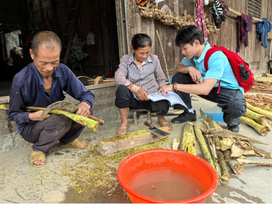 来不及午休,考虑到晚会需要彩排,我们吃过午饭就继续将村子里还没有走完的村民家庭要全部走完,看到有个爷爷的手掌没有了但还在削树皮,当我们问到手掌是怎么了,爷爷说是毒蛇咬的,结合纪老师和我们分享的另一个叔叔也被毒蛇咬到腿导致腿截肢了,能够想象在这里生活是多么难啊。尽管他们要走出去的路还很长,未来的乡村振兴工作还需要我们一代又一代人的接力,但我始终相信,只要心中有力量,风雪必将绕道而行。