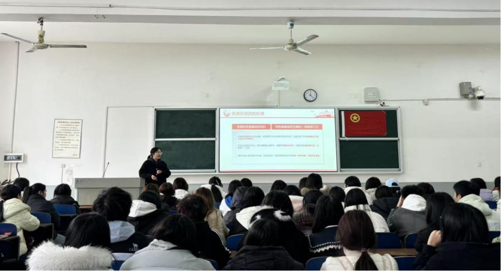 纪文婷以“明标准、知流程、守规范”为核心,围绕五大关键模块展开细致讲解:一是发展新团员的核心标准,明确思想觉悟、学业表现、社会实践等方面的硬性要求与价值导向;二是发展团员的基本程序,详细拆解各环节的具体操作、时间节点与材料规范;三是特殊情况下的团员发展细则,针对不同场景明确审批权限与特殊要求,确保工作的严谨性与灵活性;四是入团及发展团员需履行的手续,清晰列出各类表格填写、材料提交、谈话记录等关键环节的注意事项;五是入团仪式的流程与意义,强调仪式感对强化团员身份认同、责任意识的重要作用。授课过程中,她结合典型案例进行分析,通过“理论+实例”的方式帮助学员精准把握纪律红线与工作要点,让抽象的流程规范变得具体可感。
