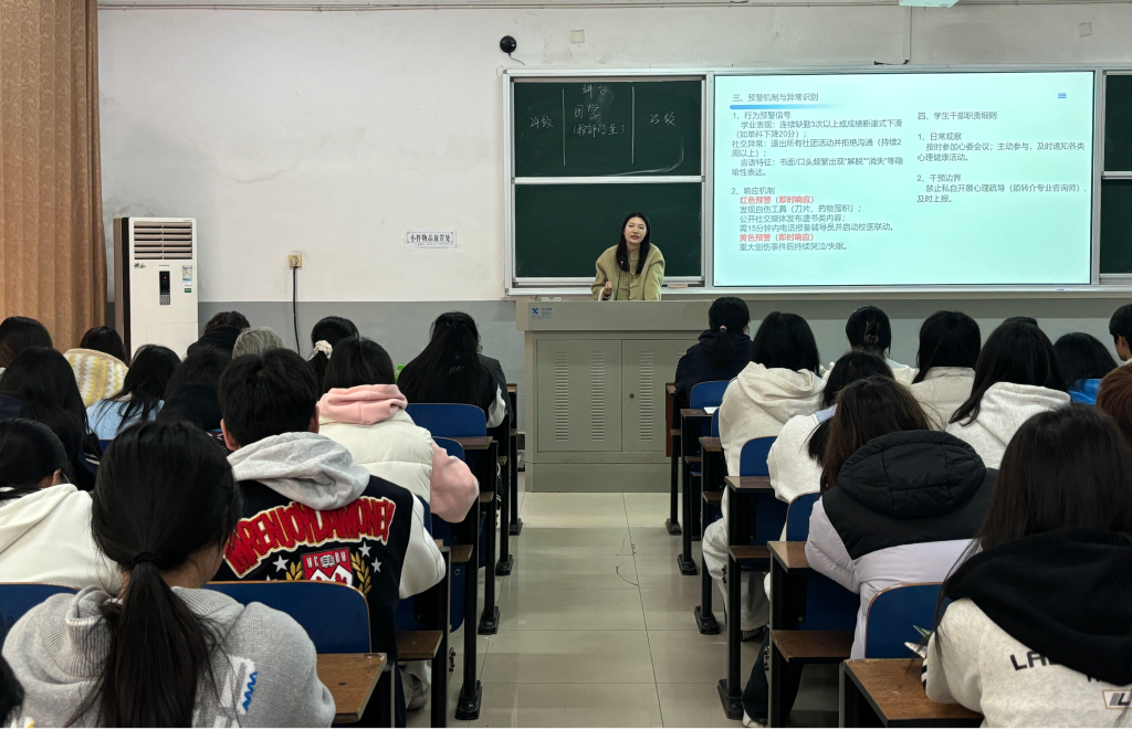 随后,心理专干易艾萍老师围绕心理安全工作分享经验。结合新学期学生可能面临的学业压力、人际交往困扰等问题,易老师讲解了常见心理问题的识别方法,分享了自我调适与同伴互助的实用技巧,引导学生干部主动关注自身及身边同学的心理健康状态,及时发现并协助解决心理困扰,共同营造积极健康的校园心理氛围。
