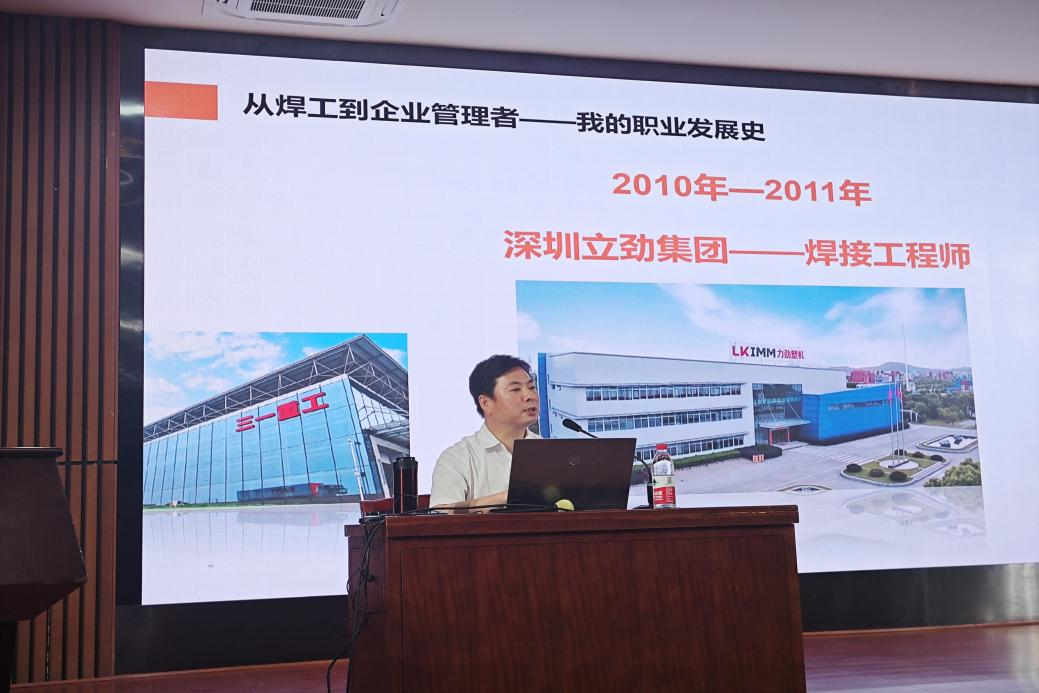 龙定华以工匠精神为主线,向在座的师生分享了他二十五年来的职业发展历程,从最初的一名普通焊工,到后来的焊接工程师、培训师,到如今的企业管理者。能取得现在的职业成就是他始终坚持工匠精神和创新意识、多年来不断奋斗、不断自我升华、自我实现的结果。龙定华勉励同学们要尽早进行个人职业规划,明确就业方向,同时珍惜在校学习时间,扎实学好专业课程,争取在寒暑假到企业、公司进行实习,提前感受真实职场,为毕业后就业积累经验。