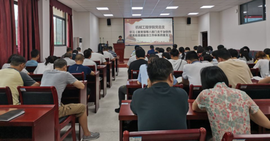 7月7日,机械工程学院举行全院教职工理论学习会,专题学习《教育部等八部门关于加快构建高校思想政治工作体系的意见》(以下简称《意见》)有关精神。