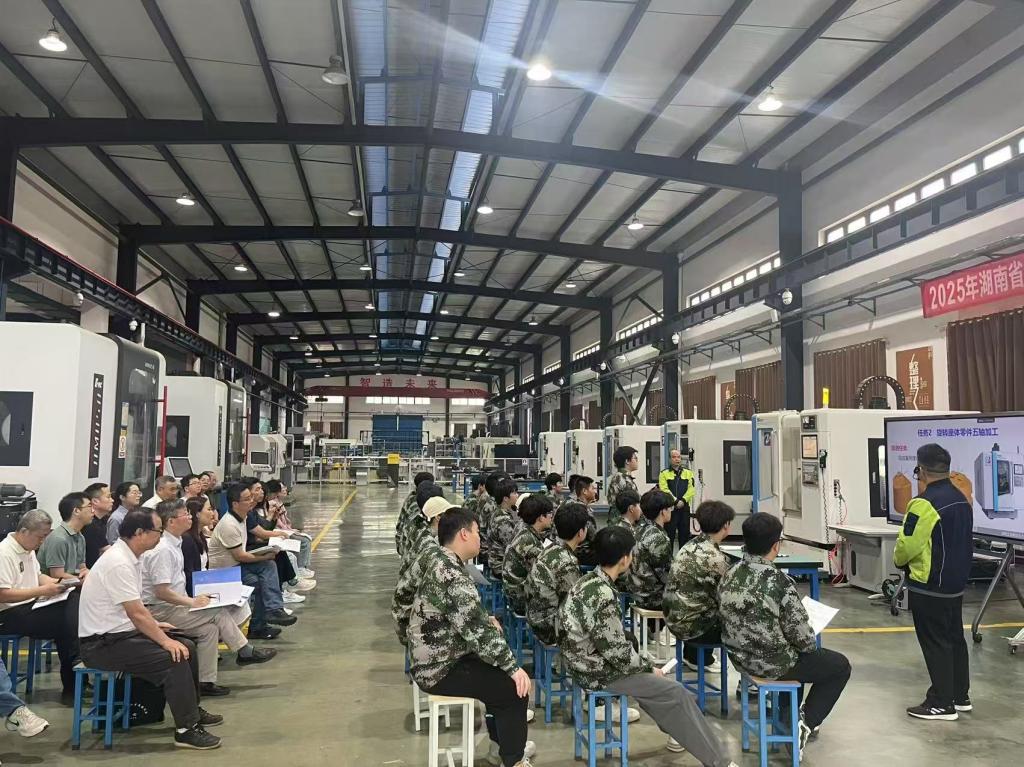 交流首站聚焦我院智能制造实训中心。长沙南方职院代表团现场观摩了五轴加工实训课程,易延辅、杨昌远两位老师以高端数控机床为载体,采用“线上+线下”混合教学模式,讲解了零件装夹、校准、虚拟仿真加工、工艺规划及五轴联动编程与加工全过程。长沙南方职院数控专业负责人表示:“这种‘虚实结合’的教学模式有效解决了传统实训中‘看不见、操作难’的痛点,值得借鉴。”
