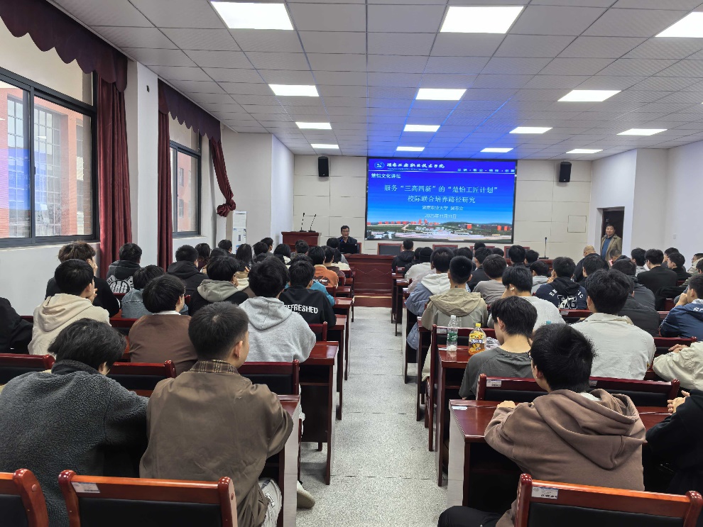 活动特邀湖南农业大学机电工程学院副院长吴志立、副书记邓益成等六位专家莅临指导,围绕楚怡文化传承与校际联合培养路径展开深入研讨。活动分为座谈会和专家讲坛两个环节,座谈会由机械工程学院党总支书记黎永祥主持,学院副院长欧阳陵江、李楷模、部分骨干教师以及与湖南农业大学联合培养的“楚怡工匠计划”三个农大班辅导员、任课教师参加;专题讲座环节则吸引了包括74名农大班学生在内的众多师生参与。