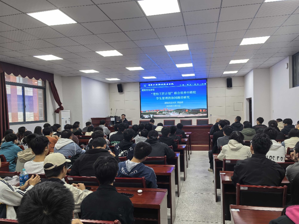 随后,邓益成副书记作了题为《"楚怡工匠计划"联合培养中跨校学生管理的协同路径研究》的专题讲座。邓副书记从学生管理实践角度出发,深入探讨了校际联合培养模式下的学生管理工作挑战与创新路径。他系统梳理了跨校学生管理中的关键环节与难点问题,分享了湖南农业大学在联合培养项目中学生思想政治教育、日常管理、心理健康、学业指导等方面的创新做法与典型经验。邓副书记特别强调了构建"资源共享、责任共担、管理协同"的跨校学生工作机制的重要性,提出了建立常态化沟通平台、完善协同管理机制、创新学生活动载体等具体建议,为提升联合培养项目的学生管理效能提供了宝贵思路。