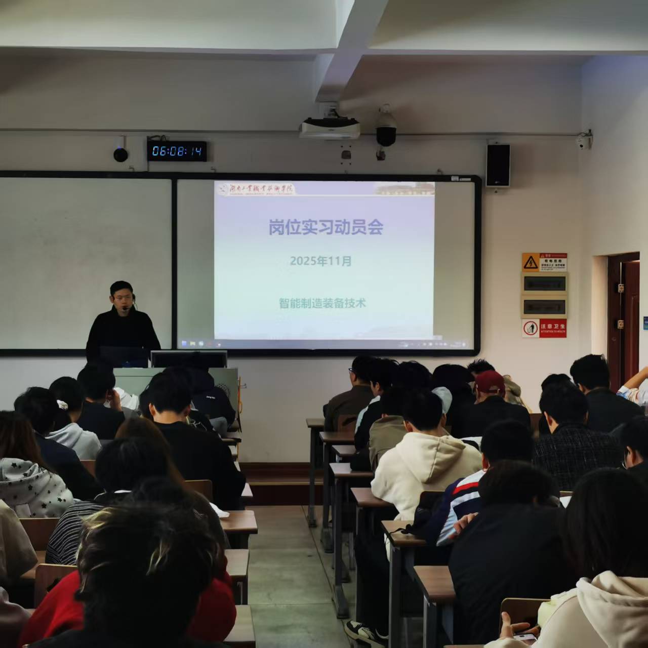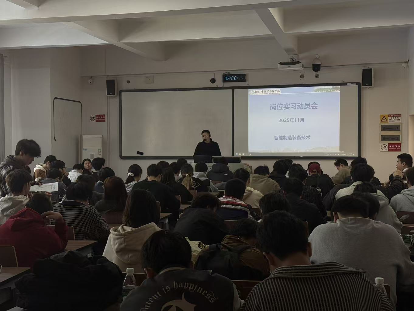 2025年11月5日,机械工程学院在机械大楼8502教室召开2023级智能制造装备技术专业岗位实习动员大会。学院实习指导教师、辅导员及2023-1、2023-2、2023-3班全体学生参加此次会议。