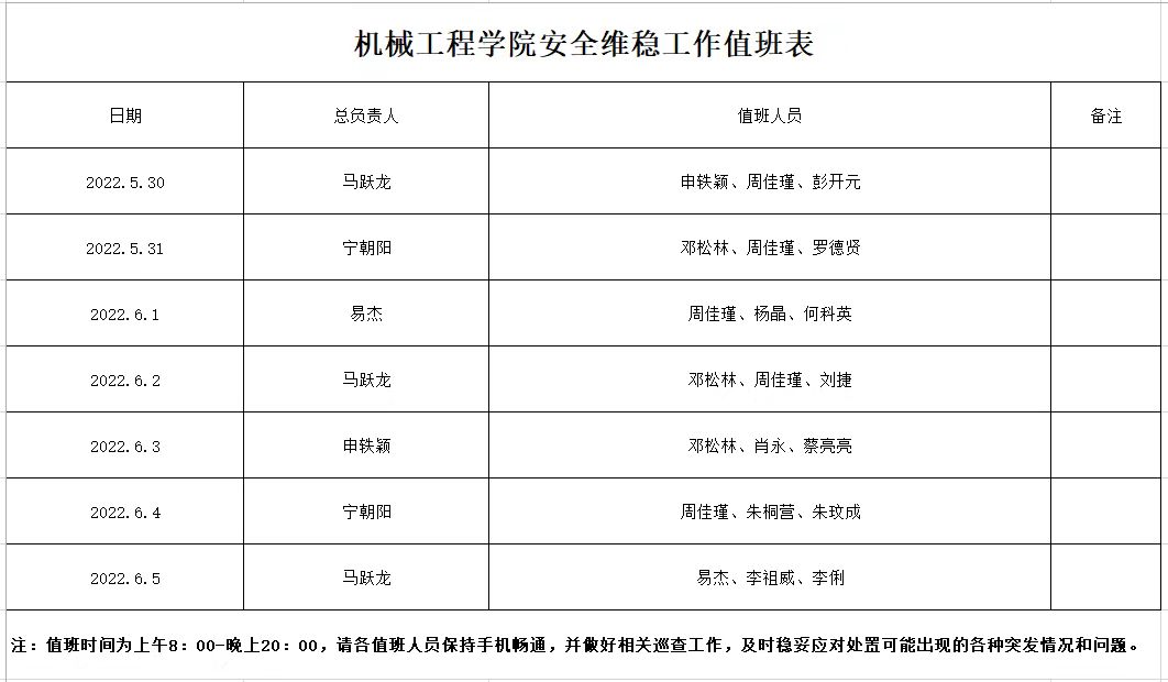 机械工程学院安全维稳工作值班表