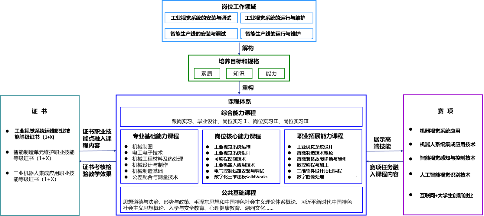 1.本课程共56学时,依据国家专业教学标准及专业人才培养方案,依托校企联合培养基地承接的视觉开发与运维项目作为教学载体,结合“机器人系统集成应用技术”技能竞赛,融入“工业视觉项目集成职业技能等级证书”(以下简称视觉X证书)技能点,以培养视觉运维现场工程师为目标,校企协同重构“能力递进、由静至动”课程内容; 2.构建三个进阶学习模块,分别为视觉系统基础、视觉集成应用和视觉系统运维。模块一从视觉识别、视觉测量到视觉检测。模块二“视觉集成应用”,从残次品剔除到产品智能分拣。模块三“视觉系统运维”,从成像调试、故障排查到产线运维,构建了三个能力递进的教学项目,共8个教学任务,16课时。 |