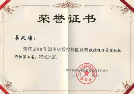 易延辅老师获2010年湖南数控技能大赛 程序员组第二名 | |