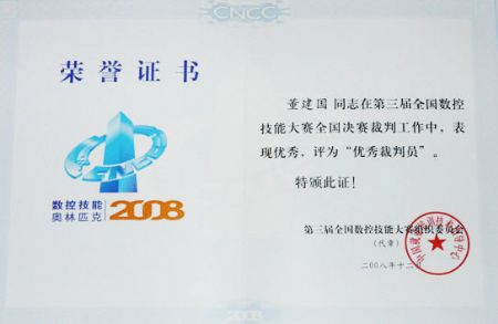 | 董建国老师在2008年在全国数控技能大赛中被评为优秀裁判员 | |
