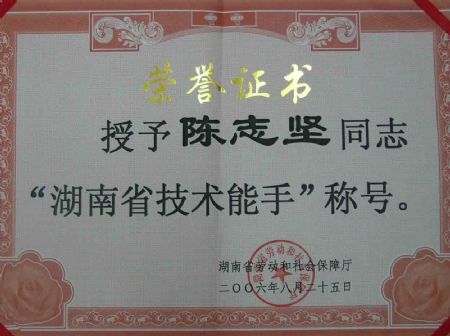 | 陈志坚老师被湖南省人力资源和社会保障厅授予“湖南省技术能手”称号 | |