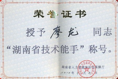 | 廖龙老师被湖南省人力资源和社会保障厅授予“湖南省技术能手”称号 | |