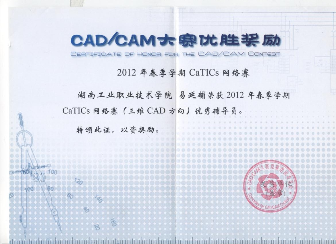 易延辅老师获2012年全国CAD/CAM大赛 优秀辅导员奖 | |