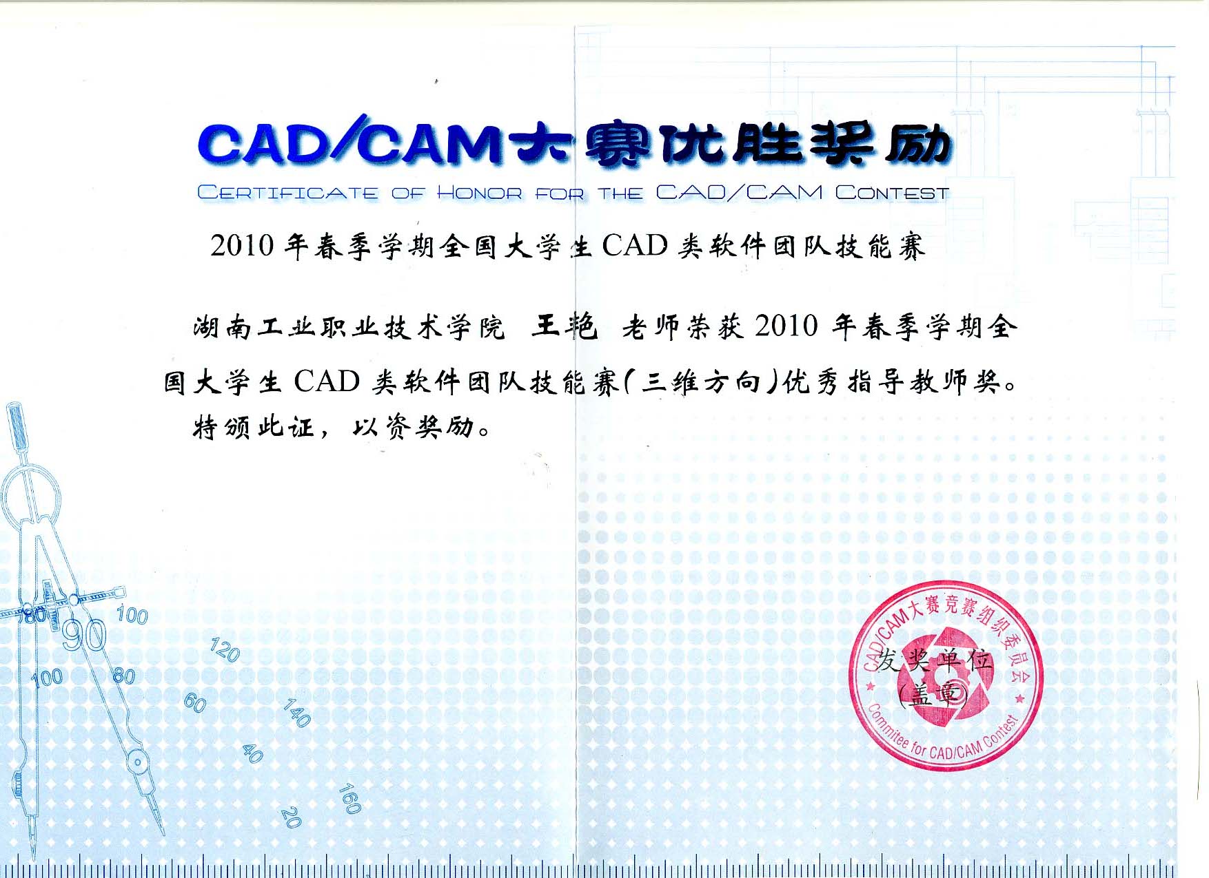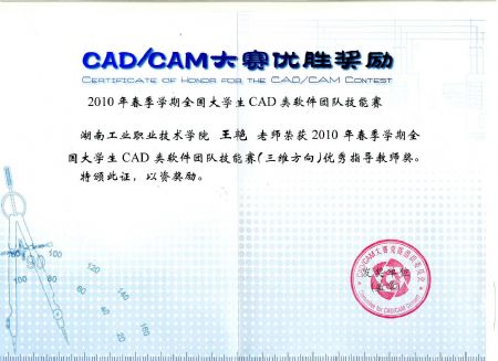 王艳老师获2010年全国CAD/CAM大赛 优秀指导教师奖 | |