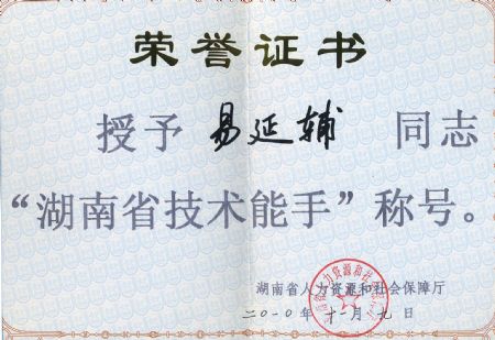 | 易延辅老师被湖南省人力资源和社会保障厅授予“湖南省技术能手”称号 | |