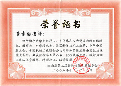 | 董建国老师在2008年在湖南数控技能大赛中被评为湖南省队优秀教练 | |