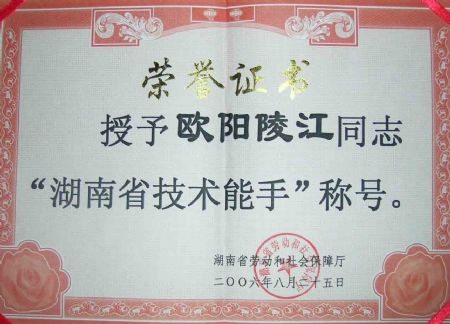 | 欧阳陵江老师被湖南省人力资源和社会保障厅授予“湖南省技术能手”称号 | |