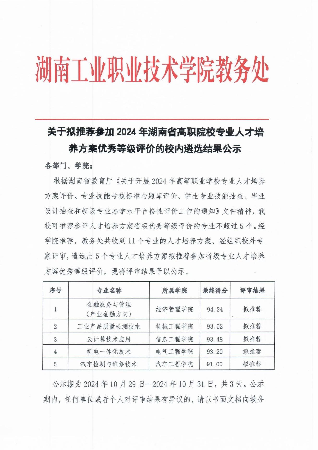 关于拟推荐参加2024年湖南省高职院校专业人才培养方案优秀等级评价的校内遴选结果公示
