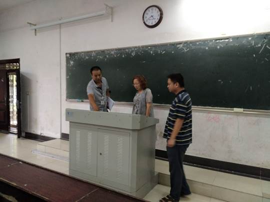 图为邱丽芳副院长检查多媒体教学设备运行情况