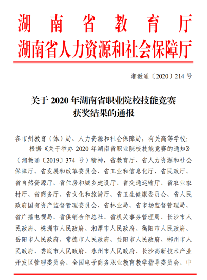 在学校领导高度重视、老师悉心组织培训、学生辛苦准备训练下,我校荣获2020年湖南省职业院校技能竞赛团体奖一等奖第一名的优异成绩。