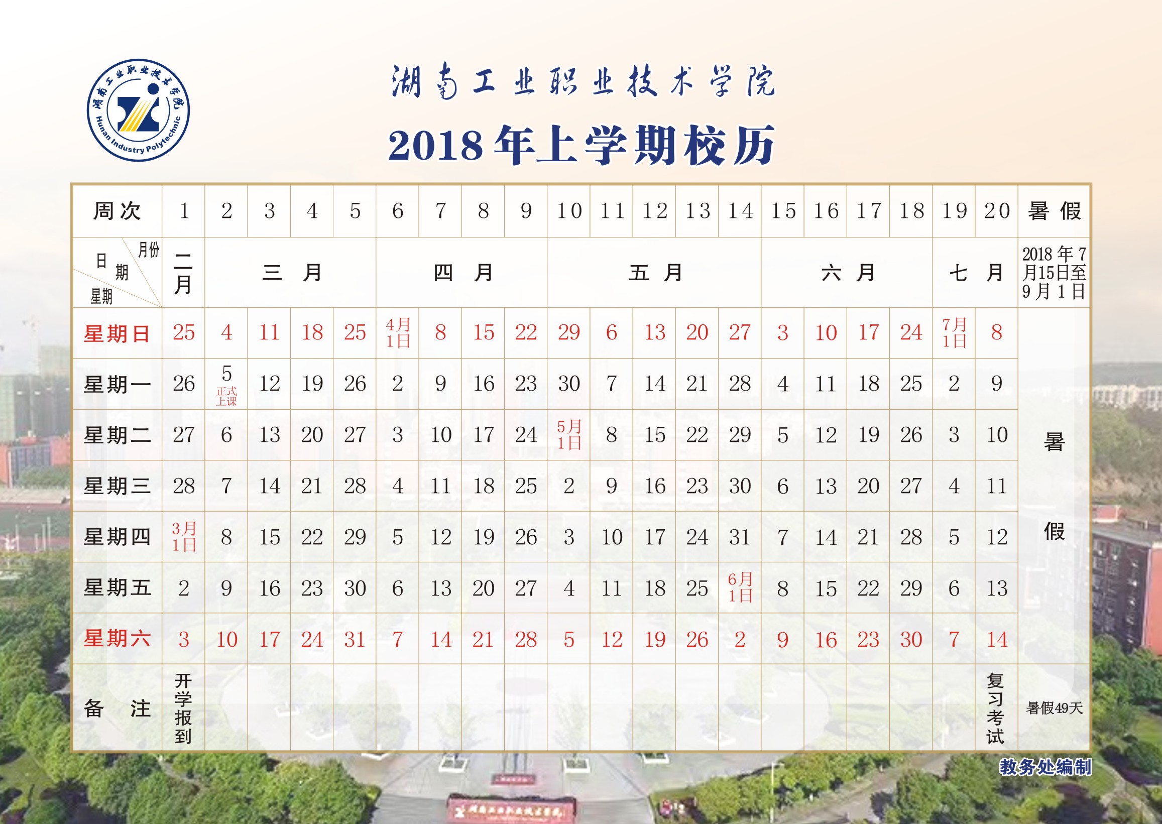 2018年上学期校历