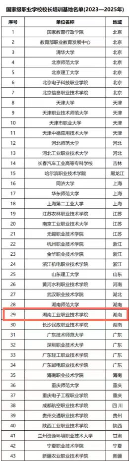 据悉,为加快建设教育强国,提升职业学校校长办学治校能力,打造高品质学校,教育部经省级教育行政部门推荐、中央部门所属高校自主申报和专家综合评议,对“十三五”时期以来各类国家级职业学校校培训基地进行调整与遴选,最终共确定43个基地为2023-2025年国家级职业学校校长培训基地,全国共有27所高职院校入选,湖南仅有3所。