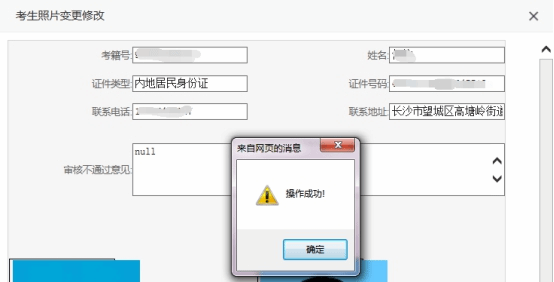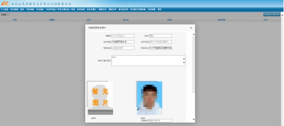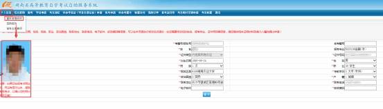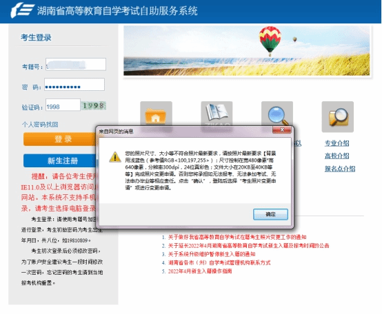 登录“湖南省高等教育自学考试自助服务系统”(https://zikao.hneao.cn/net,使用ie11以上的浏览器,不支持手机操作),照片不符合要求的登陆后会出现如下对话框,点击“确定”即可正常登录。