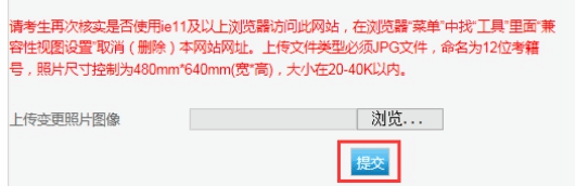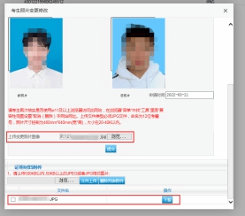 5、点击照片下面的“选择文件”选择已经修改好规格的照片;点击证明材料附件下面的“选择文件”选择手持身份证正面照片(照片样式可参考下图);两个都上传后,点击两个头像照片下面的“提交”。