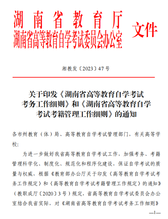 关于修订印发《湖南省高等教育自学考试考务工作细则》和《湖南省高等教育自学考试考籍管理工作细则》的通知