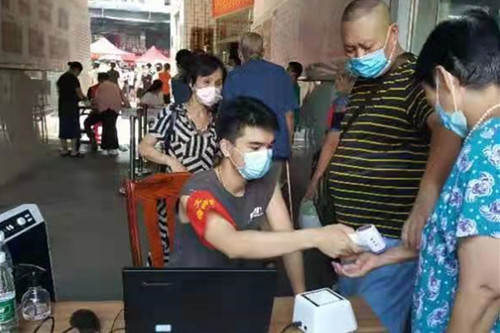查看健康码、为检测者量体温等工作之余,作为学生记者的喻广还承担起了防疫志愿服务活动的摄影工作。现场,有志愿者耐心的为爷爷奶奶讲解,有警察细心带领被检测者前往指定区域,有医生护士们高温之下为大家做检测……他用相机记录下每一帧温暖画面。