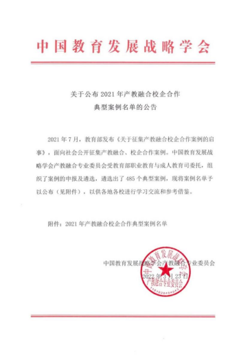 本网讯 3月23日,中国教育发展战略学会产教融合专业委员会公布了2021年产教融合校企合作典型案例名单,共遴选出了485个典型案例。电子pg游戏平台下载申报的案例《职业教育校企合作办学模式改革与实践》脱颖而出,入选产教融合优秀典型案例。