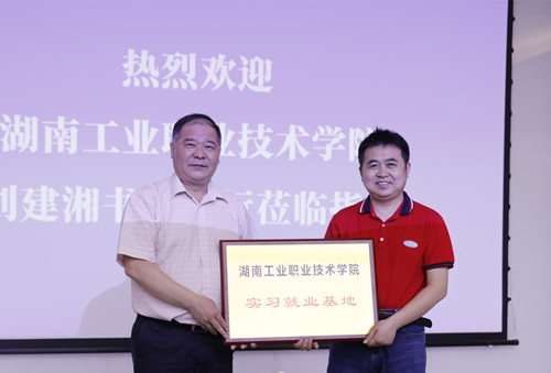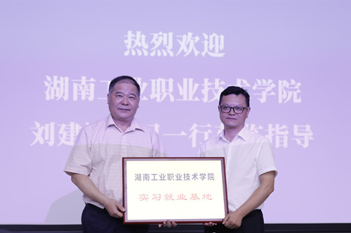 电子pg游戏平台下载党委书记刘建湘(左)代表学校向湖南湘江电缆有限公司授牌“实习就业基地”