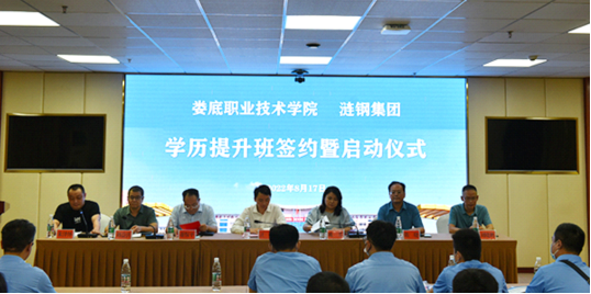 8月17日,娄底职业技术学院与华菱涟钢联合举办学历提升班签约暨启动仪式,涟钢副总经理汪净、人力资源部部长谢保平、人力资源部党委书记陈晓出席,娄底职业技术学院副校长欧芳、继续教育学院院长刘益洪、继续教育学院副院长刘晓鹏、朱泽怀出席,50名学员代表参加仪式。朱泽怀主持仪式。