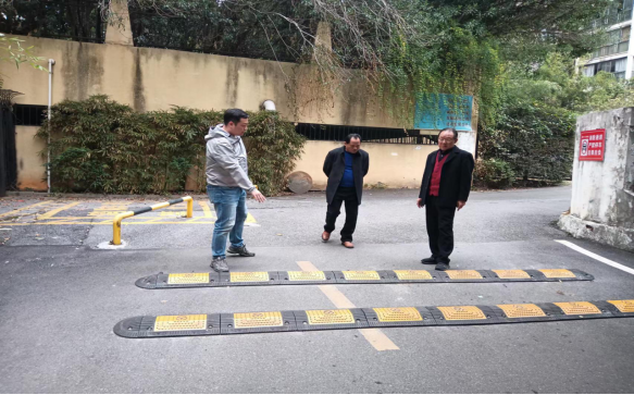 雨花校区位于城区中心地带,与城市主干道韶山路连接,进出车辆较多,人车混行,不少教职工居民说,他们在散步时总是提心吊胆,车辆多,车速过快,校区道路窄,对居民人身安全造成隐患。校区居民廖哲志说,进出小区有坡路,每天外出小区的车辆多,建议加装“减速带”。离退休工作处了解到教职工居民的需求后,马上落实并解决了问题联系后勤处派施工人员在校区主要交叉路口安装了减速带。