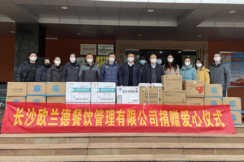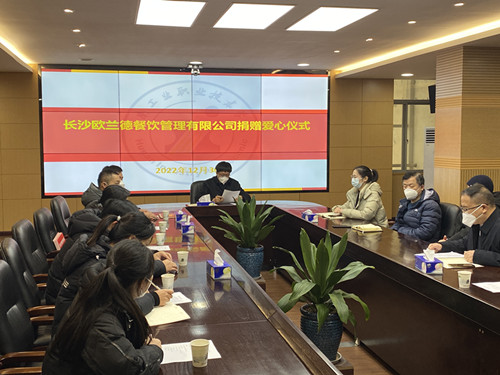 长沙欧兰德餐饮管理有限公司代表何志威,党政办、组织人事处、宣传部、后勤处、离退处等部门负责人,后勤处医卫科全体人员,在职教师代表、离退休教师代表参加了捐赠仪式。