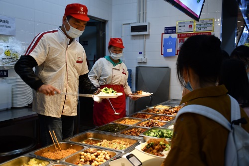 “同学,想吃什么菜?”“已打包,请拿好。”在学校食堂,食堂工作人员的热情服务,让考生心中暖暖的。