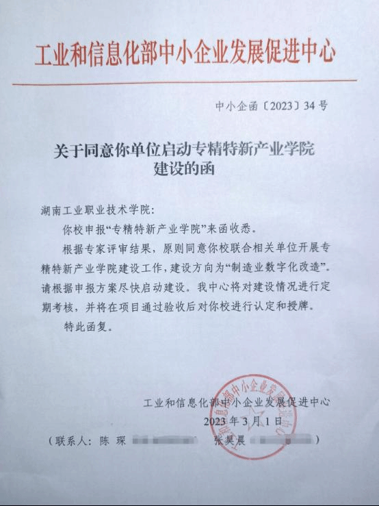 本网讯 近日,工业和信息化部中小企业发展促进中心发来函件,同意我校启动专精特新产业学院建设工作。据悉,学校是湖南省唯一一所第一批获工信部立项建设专精特新产业学院的高职院校,本次项目申报由信息工程学院负责完成。