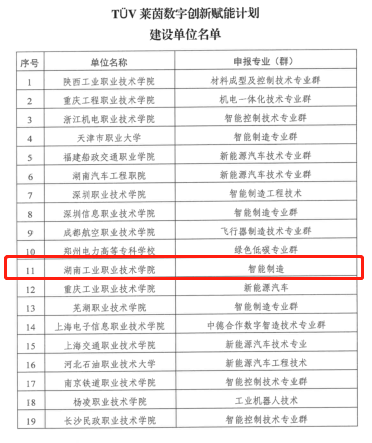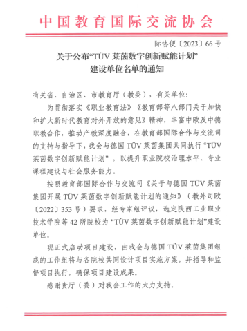 本网讯 近日,中国教育国际交流协会公布了“TÜV莱茵数字创新赋能计划”建设单位名单,我校成为42个建设单位之一,建设专业(群)为“智能制造”,在获批名单内排名第十一。