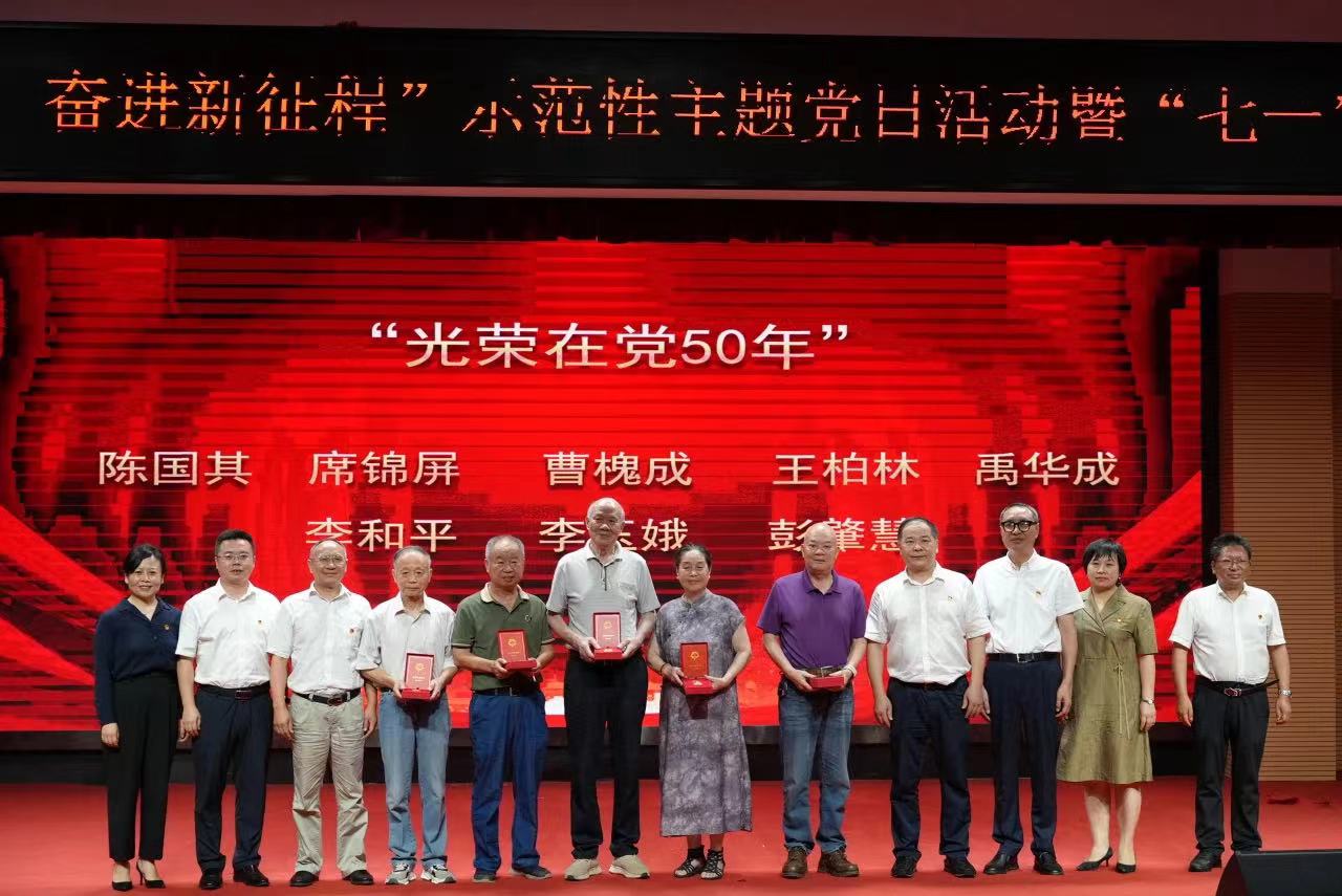离退休工会党总支部带来合唱《我们共产党员好比种子》。学校为李和平等8名老党员颁授“光荣在党50年”纪念章。现场39名新党员集体宣誓,全体参会人员合唱《我们走在大路上》。