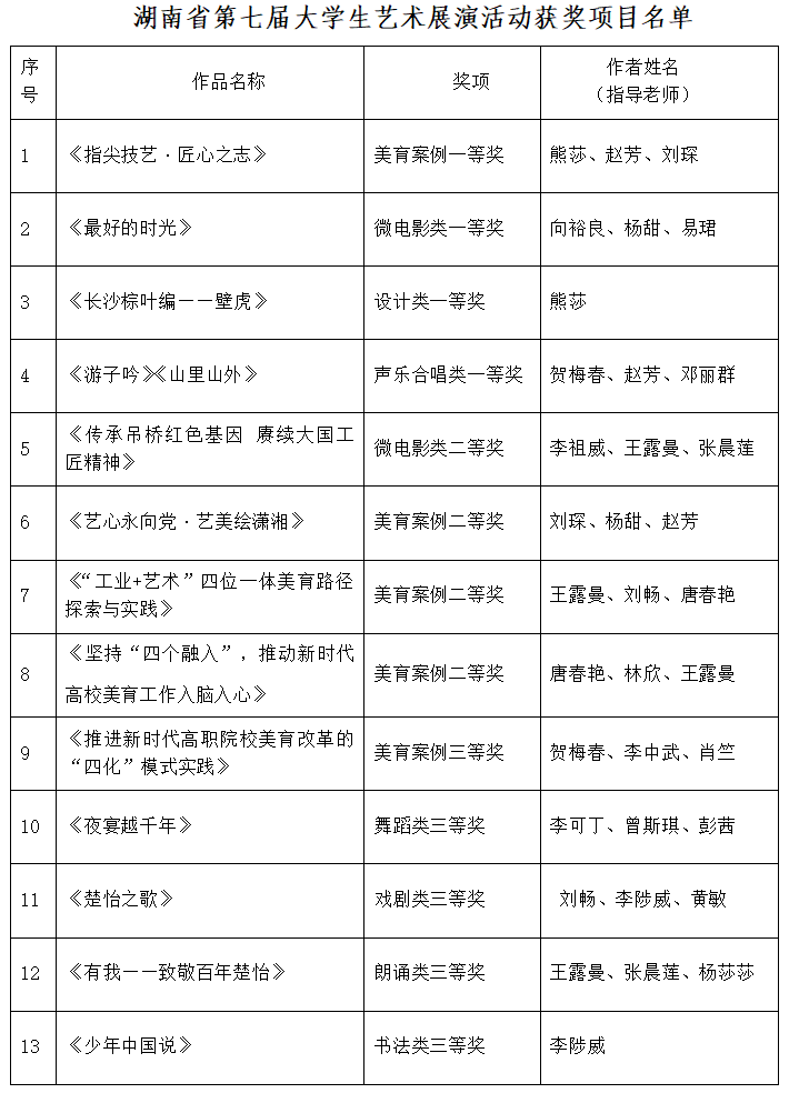 近日,湖南省第七届大学生艺术展演活动评选结果出炉,我校成绩喜人,其中艺术表演类组别获一等奖1个、三等奖3个,艺术作品类组别获设计一等奖1个、微电影一等奖1个、微电影二等奖1个、书法三等奖1个;美育案例类组别获一等奖1个、二等奖3个、三等奖1个,其中美育案例一等奖报送全国大学生艺术展演活动。同时,学校还获得优秀组织奖。