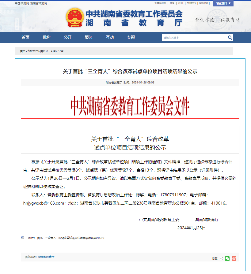 本网讯 1月26日至2月1日,中共湖南省委教育工委、湖南省教育厅对首批“三全育人”综合改革试点单位项目结项结果进行公示。我校机械工程学院“三全育人”改革试点院系验收等级为优秀。