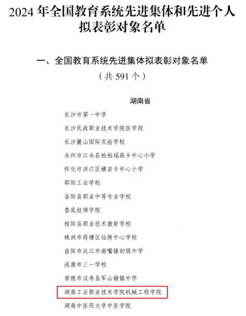 本网讯 在中华人民共和国成立75周年和第40个教师节到来之际,为大力弘扬教育家精神,营造全社会尊师重教浓厚氛围,激励全国广大教师和教育工作者落实立德树人根本任务,积极投身教育强国建设,人力资源社会保障部、教育部决定授予585个单位“全国教育系统先进集体”称号;716名同志“全国模范教师”称号;895名同志“全国优秀教师”称号;80名同志“全国教育系统先进工作者”称号;99名同志“全国优秀教育工作者”称号。其中,我校机械工程学院被授予2024年“全国教育系统先进集体”荣誉称号。