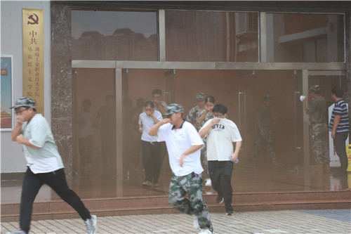 知识讲座和实操培训结束后,同学们进行消防疏散演练。警报声响起,同学们立即进入状态,纷纷捂住口鼻,以低头弯腰的姿势有条不紊地从尚善楼、知行楼转移到学校足球场。整个演练过程大家动作规范,整齐有序,各营各连队组织迅速,清点人数后向消防演练总指挥报告。